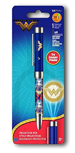 -. Feature : Wonder Woman projector pen. / Push button activated Bright and Colorful Wonder Woman projection scene. / This black Ink pen projector pen make a great gift or party favor. / 1.0 mm pen twist tip pen, batteries included. / This Wonder Woman projector pen is great for any Wonder Woman Movie or comics fan!