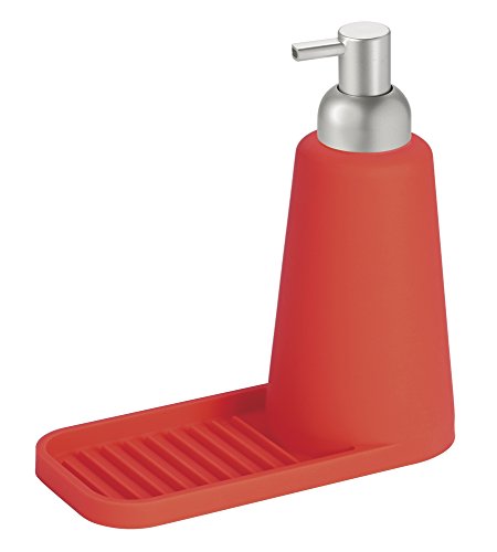 mDesign Silcone Soap Dispenser Pump and Sponge Tray Organizer for Kitchen Counterop - Red/Brushed