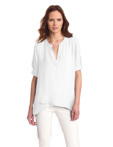 Slightly sheer long-sleeve blouse with roll-tab sleeves and split V-neck placket
