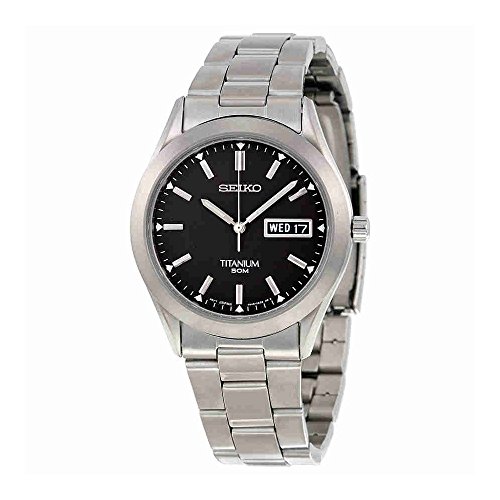 Spruce up your look with this men's titanium watch by Seiko. The gray dial with silver tone hands and markers lends a striking appearance and the day/ date display offers added convenience. 50 meters water resistant.