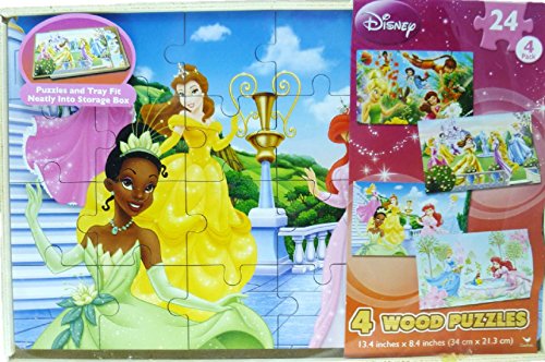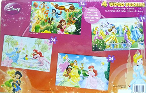 Studio : Cardinal Publisher : Cardinal Binding : Toy Product Description 4 puzzle designs feature princesses Snow White, Cinderella, Aurora, Ariel, Belle, Tiana and fairies including Tinker Bell. Enjoy the beauty of Disney artwork on wood puzzles that measure 13.4 inches x 8.4 inches each. There are 24 pieces per puzzle. Puzzle pieces fit nicely in 4 slots of the puzzle box. No spills possible when the sliding lid is closed. Imported. 0