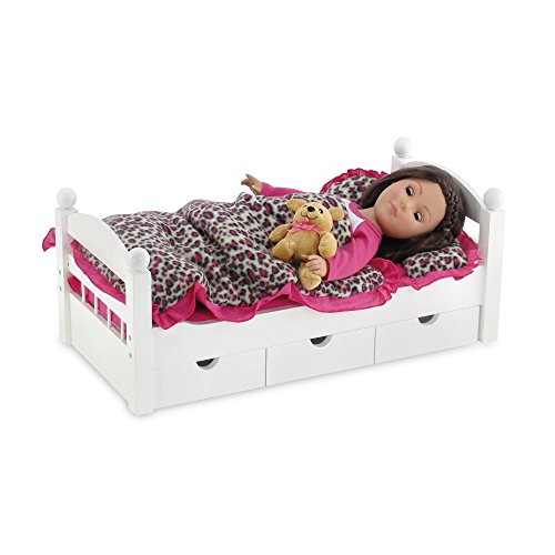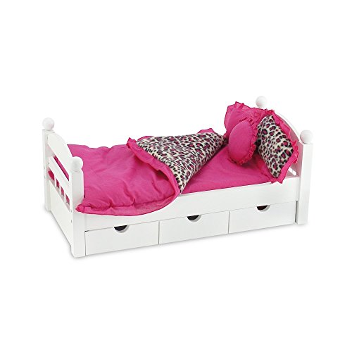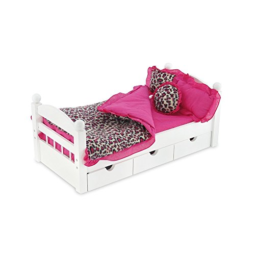 Reversible bedding! What a value! Get warm and cozy under the covers of this soft cheetah print/pink 18 inch doll bedding set! Gorgeous, thick and fluffy, this comfy, reversible bedding ensemble includes a reversible cheetah print/pink comforter with ruffle, 1 rectangular, reversible cheetah print/pink pillow with ruffle, 1 rectangular solid pink pillow with ruffle, 1 reversible round cheetah print/pink pillow with ruffle, and a solid pink sheet. This snuggly doll bedding will go great with a quality bed from our Emily Rose Doll Clothes exclusive line of furniture products. Sweet Dreams! *Doll Not Included* *Bed Not Included*Feature
