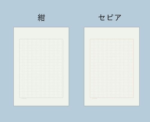| 仕様 | 用紙サイズ:210×148mm(A5判) 罫線範囲:157×117mm 上の余白:31mm、下の余白:21mm、横の余白:15mm 升目の大きさ:8×9mm(縦×横) 罫線の色:セピア・紺 各25枚ずつ ルビ罫有り/200字詰め 50枚天糊製本/クリーム紙 |
