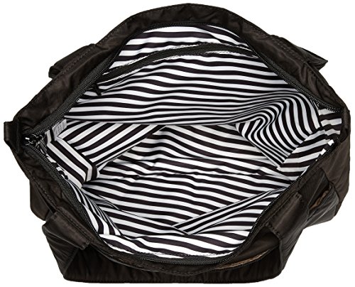 The Ju-Ju-Be Onyx Collection Be Light Tote Bag is chic, smart, ultra-light and functional with extra pockets for added versatility. It's one thing to be light. It's another to be ultra crazy, feather light. This awesome tote can pack down so small that you'll swear it's not really there, but it still holds a ton when you need it to. Perfect sized straps and just the right number of pockets. You won't find a better bag, only heavier ones. The inner lining is protected with an Agion natural antimicrobial treatment that inhibits and reduces the growth of odor-causing bacteria, mold and mildew. The outer fabric is treated with Teflon fabric protector, making it easy to repel stains and keep the Be Light clean. The Be Light has (3) total pockets for keeping you ultra-organized - (2) on the front and (1) on the inside - and a 12-inch drop strap. The front of the Be Light has (2) Insulate-lined pockets that will help you to keep all your beverages hot or cold. The main zippered section is large enough to hold all your daily essentials, plus some extra room for things like diapers, wipes and soft toys for your little one. Inside the main section is a zippered inner pocket that is perfect for holding cell phones, sunglasses and even your camera. This bag is machine washable and measures 12-inches by 14-inches by 3-inches in size. The Black Out print is all black with black and white striped lining. The print is accented by all black, metal hardware. All Ju-Ju-Be Bags come with a Lifetime Limited Warranty against manufacturing defects when purchased from an Authorized Ju-Ju-Be Dealer. Authorized Dealers can be found in the images. Founded in 2005, Ju-Ju-Be is a Southern California company that uses science, style, and attitude to create diaper bags, purses and other fashionable accessories. Ju-Ju-Be assimilated the most advanced technology possible to create a stylish and intelligent product line that's unrivaled in the industry.Feature