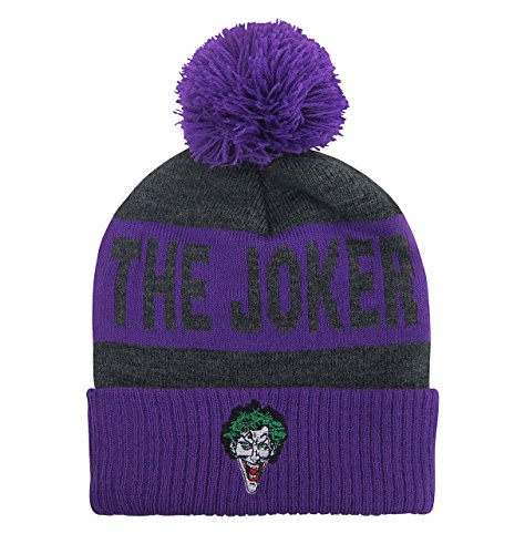 Binding : Apparel Product Description A useful, temperature-controlling signifier identifying an obvious gang affiliation. What?? Basically, I'm saying this: If a gaggle of giggling ne'er-do-wells are robbing banks during a snow storm-- and they're wearing Joker Classic Pom Pom Beanies -- chances are, they're disposable members of the Joker Gang. Right, that Joker Gang -- the gang led by the seriously disturbed, explosive-cotton-candy-administering "Clown Prince of Crime." Made from a soft and stretchy 100% acrylic, this Joker beanie features a crazed, raised and embroidered Joker face affixed to a roll-up cuff. Above the cuff and framed by subtle gray stripes, an encircling and repeating Joker logo. And above all of the above, a soft, fluffy, and extremely purple pom pom. YAY! 0