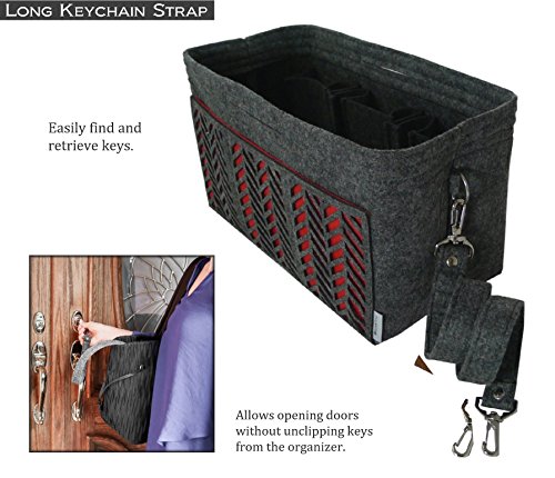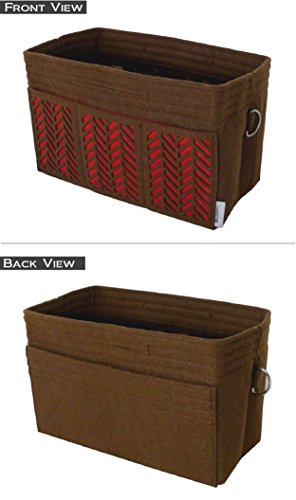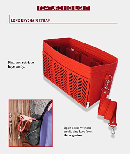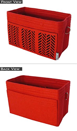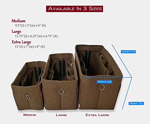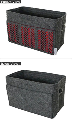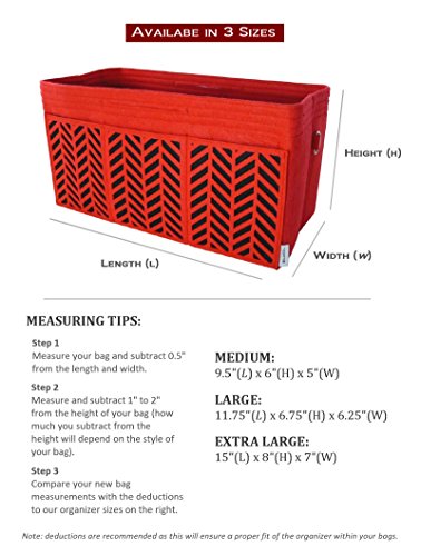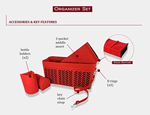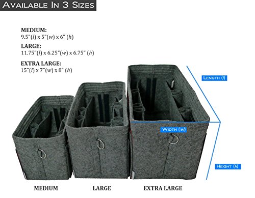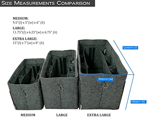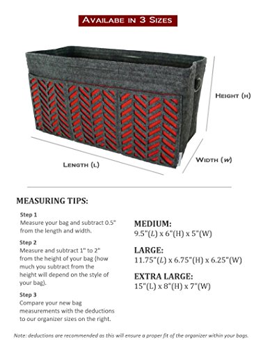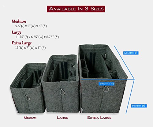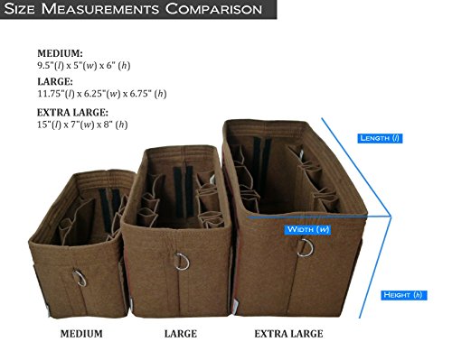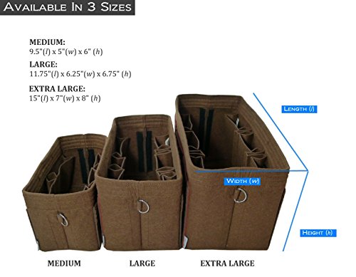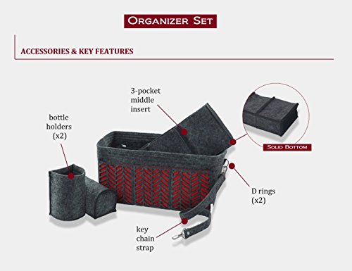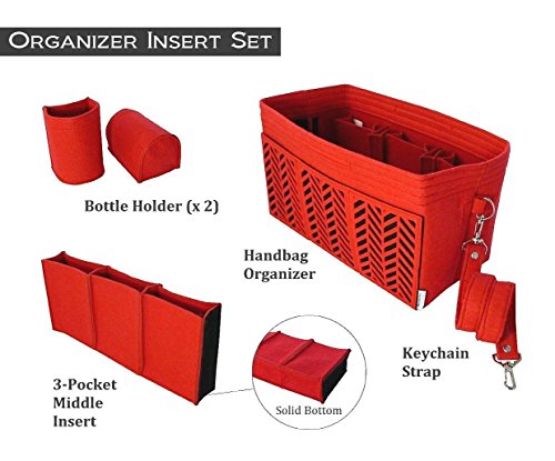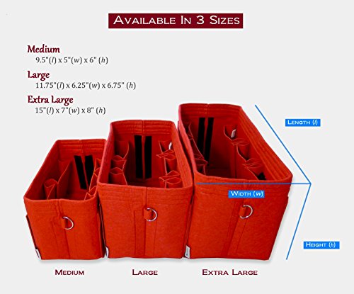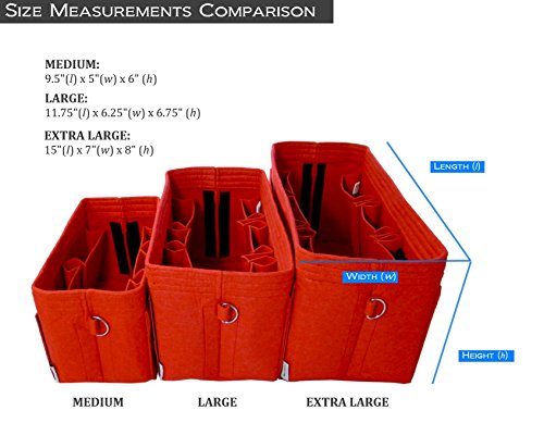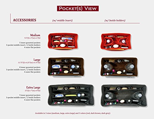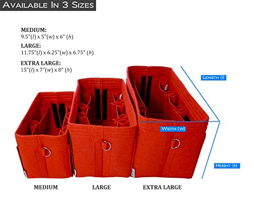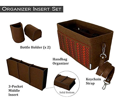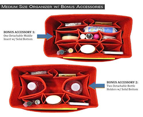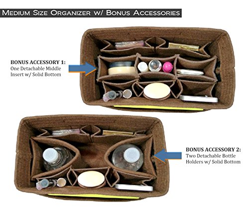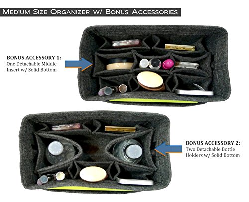 Product Description Medium organizer (approx size): 9.5" L x 5" W x 6" H. Each organizer set includes one (1) organizer, one (1) middle insert, two (2) bottle holders, and one (1) keychain strap. QA1: How do you clean this product? Please use a damp cloth to wipe off the stain and let air dry. Do not machine wash or use a dryer. QA2: What is this product made of? 80% polyester, 10% wool, 10% polypropylene. QA3: Are your organizers compatible with Louis Vuitton handbags and other branded handbags? Yes, our products are compatible. Please measure your bags first to ensure proper fit prior to making your purchase. 0