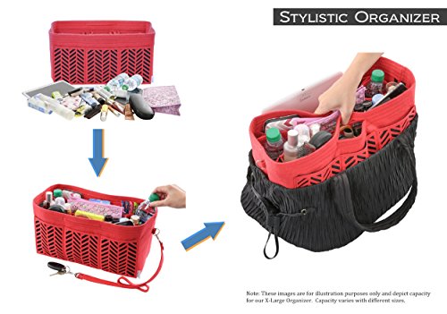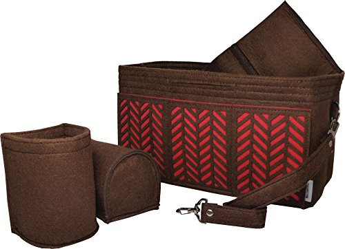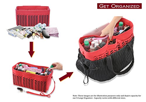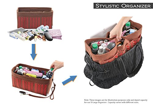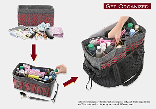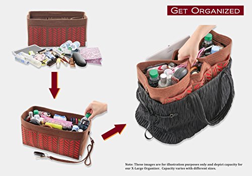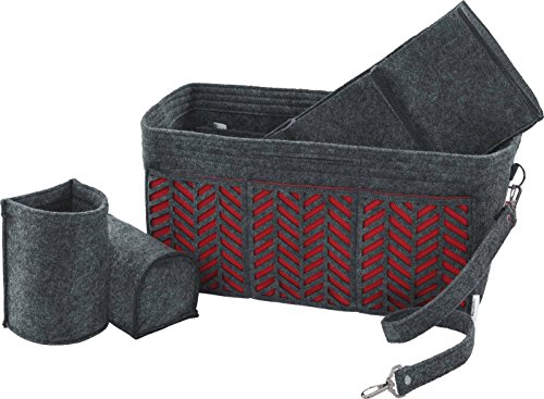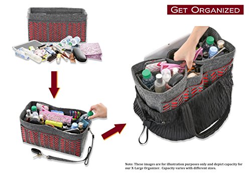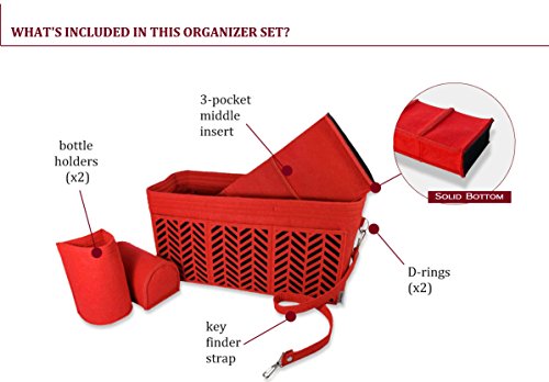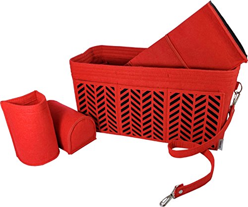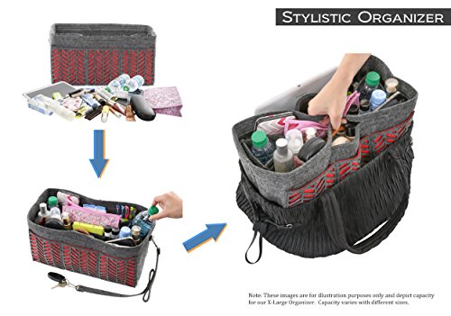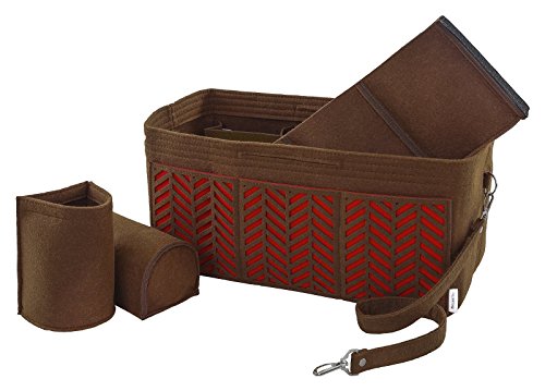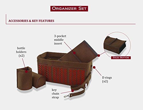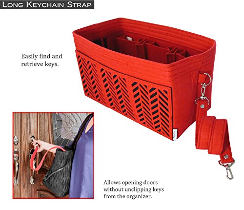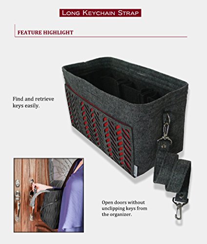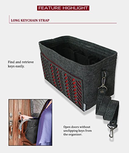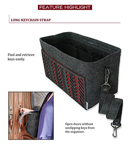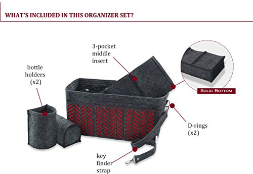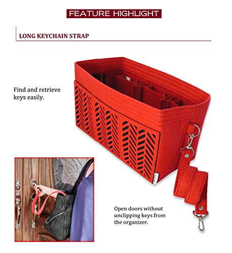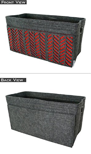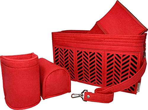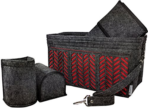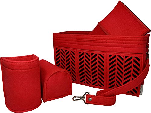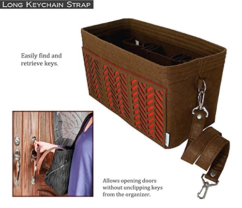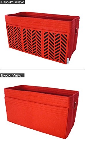 Product Description Medium organizer (approx size): 9.5" L x 5" W x 6" H. Each organizer set includes one (1) organizer, one (1) middle insert, two (2) bottle holders, and one (1) keychain strap. QA1: How do you clean this product? Please use a damp cloth to wipe off the stain and let air dry. Do not machine wash or use a dryer. QA2: What is this product made of? 80% polyester, 10% wool, 10% polypropylene. QA3: Are your organizers compatible with Louis Vuitton handbags and other branded handbags? Yes, our products are compatible. Please measure your bags first to ensure proper fit prior to making your purchase. 0