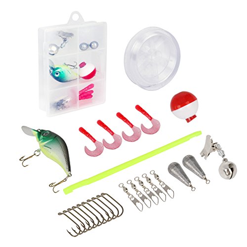 Fishing Lure Set: Lifelike designs of the lures imitate the swimming action of small fish, helps to attract a larger catch. Comes with a crankbait, 3 curly tail lures, 2 sinkers 15g, 10 fishing hooks, 5 barrel swivels with connector rings, fishing float and fishing bell alarm