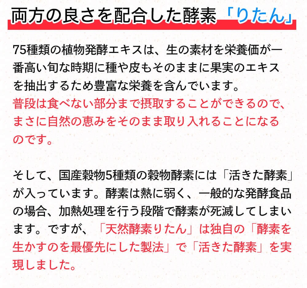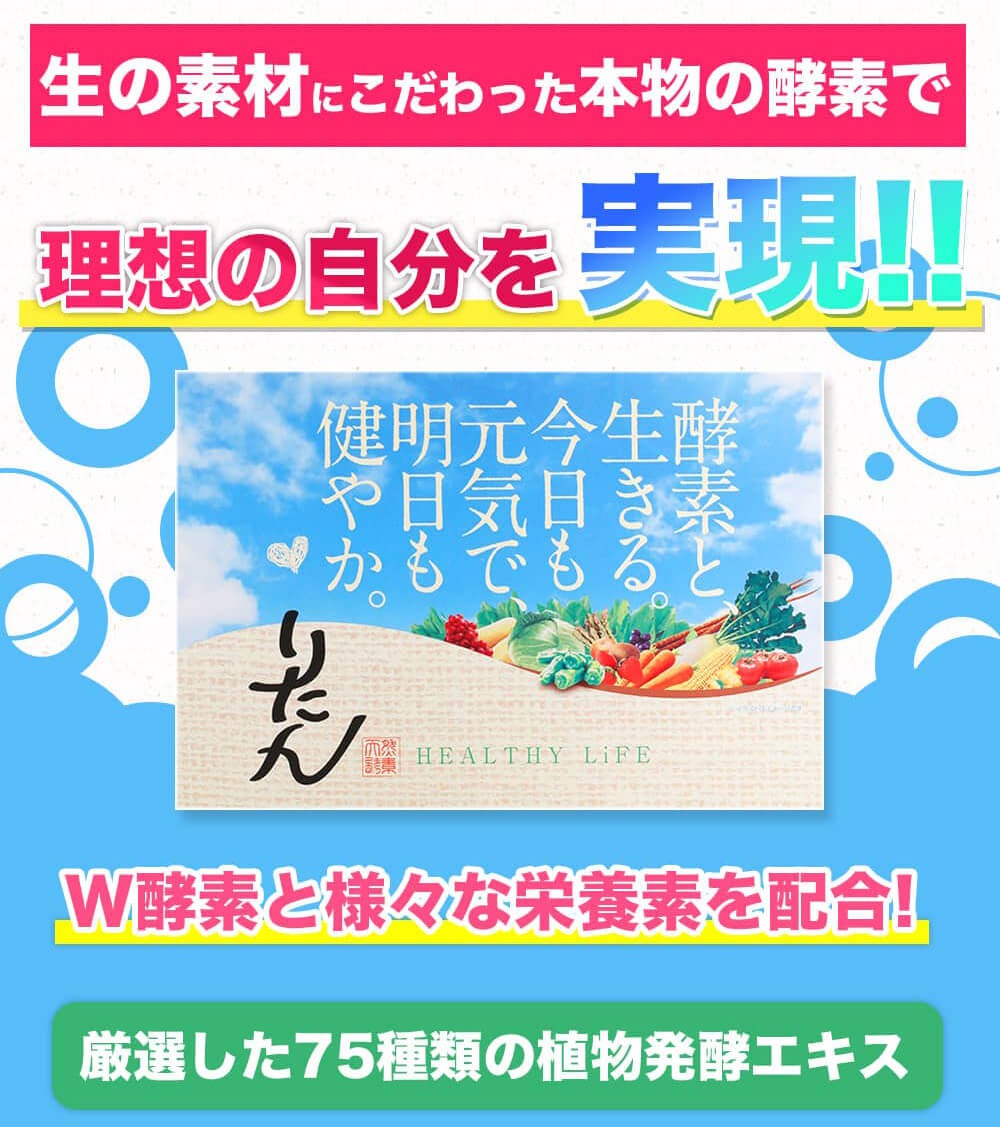 ※商品到着後、レビューを投稿して頂いた方にRITANプレミアムオイルのサンプルを10包お送り致します。レビュー内に注文番号の下3桁をご記入くださいませ。【商品名】天然酵素りたん 植物発酵エキス含有加工食品【内容量】30g(2g×15包)1日2gで15日分【栄養成分】1包(2g)あたりエネルギー7.98kcal たんぱく質0.016g 脂質0.032g 炭水化物1.906g ナトリウム0.32mg【製造国】日本【保存方法】直射日光、高温多湿な場所を避けて涼しい所で保管してください。【お召し上がり方】1日1包を目安にそのままお召し上がりになるか、お水、またはぬるま湯でお召し上がりください。【取り扱い注意】原材料をご参照の上、食品アレルギーのある方、体質、体調に合わない場合はお召し上がりにならないでください。通院、投薬中、妊娠中、授乳中の方は医師にご相談の上、ご使用ください。野菜、果物などを使用しているため、色調や風味に多少の違いが生じる場合がありますが、品質には問題ありません。(送料無料 サプリ 国産 酵素ダイエット 粉末 無添加 酵母 美肌 美容 健康 ダイエット 人気 美味しい おすすめ ランキング 置き換えダイエット食品 ファスティング)