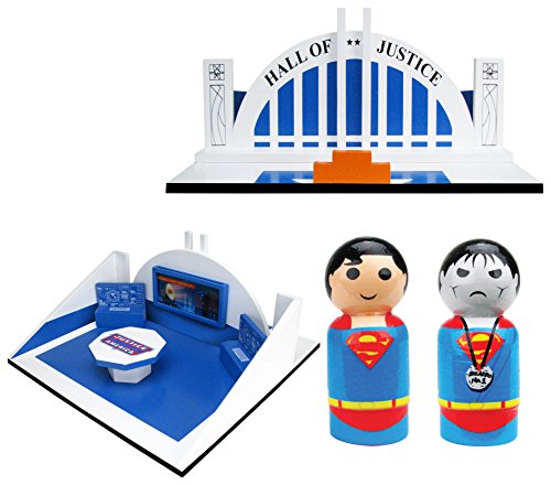 -. Feature : Wooden Hall of Justice pin Mate ama Playset! / Features a Justice League table, two computer command centers, and interchangeable display screens. / Includes individually numbered, retro-styled, 2-inch scale wooden figures of Superman and Bizarro! / All feature highly detailed, brightly colored, 360-degree artwork.