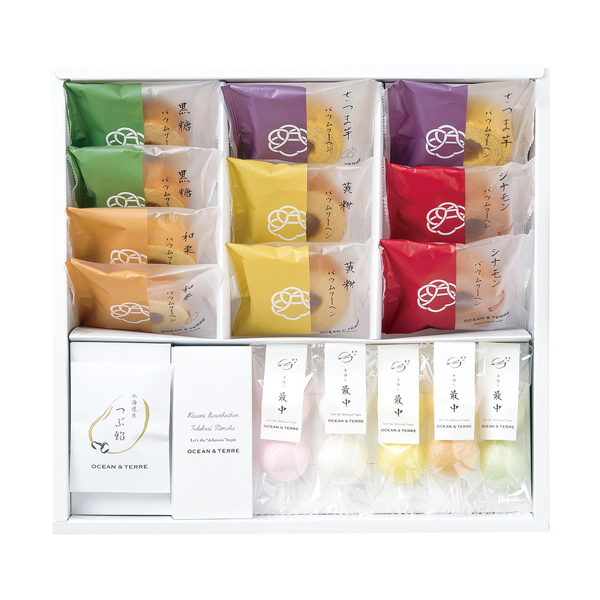●黄粉バウム・黒糖バウム・シナモンバウム・さつま芋バウム・和栗バウム・黒蜜10g×各2、最中(もち米 国産)2g×5、北海道粒あん35g×3
