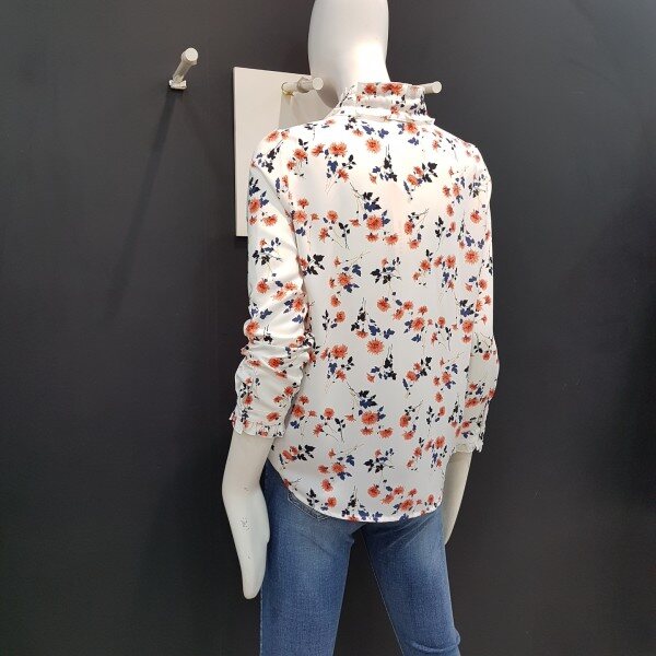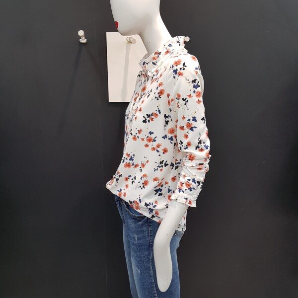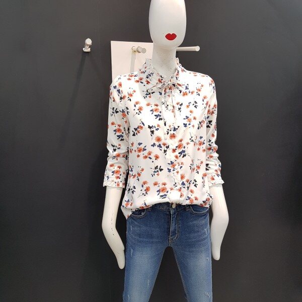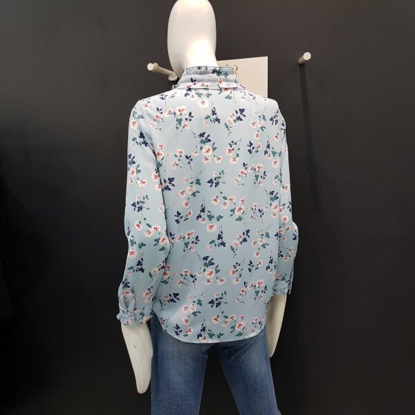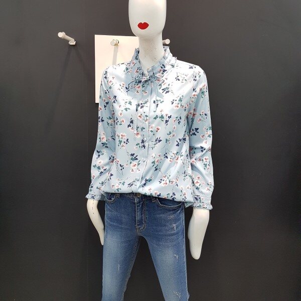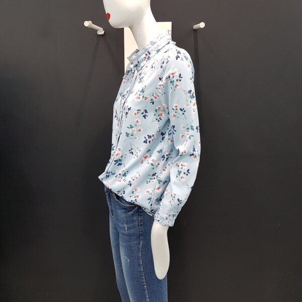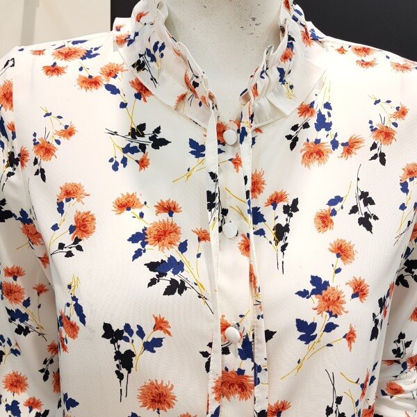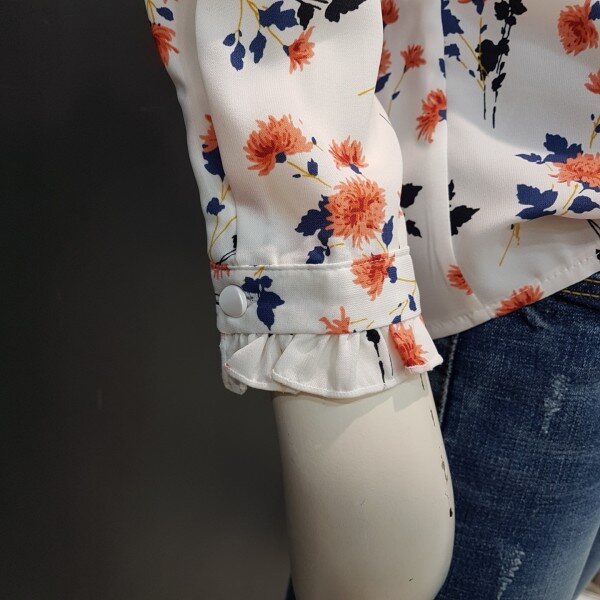 넥라인과 소매밑단 프릴장식으로 여성스러운 쉬폰 블라우스입니다.여러 아이템과 매치하여 트렌디하게 연출해보세요.