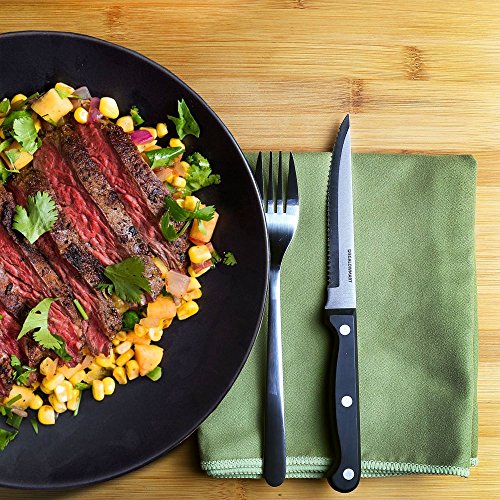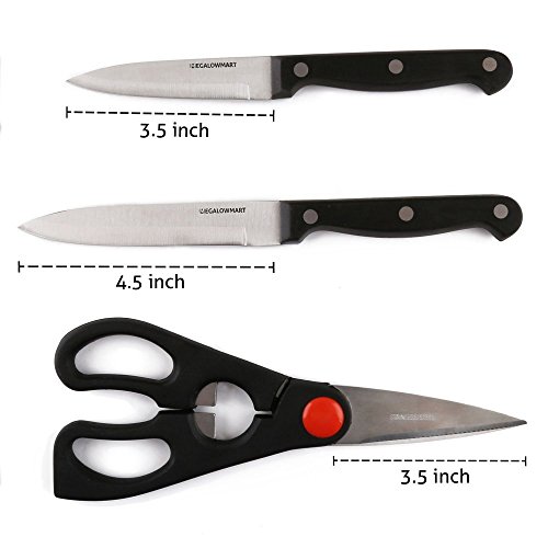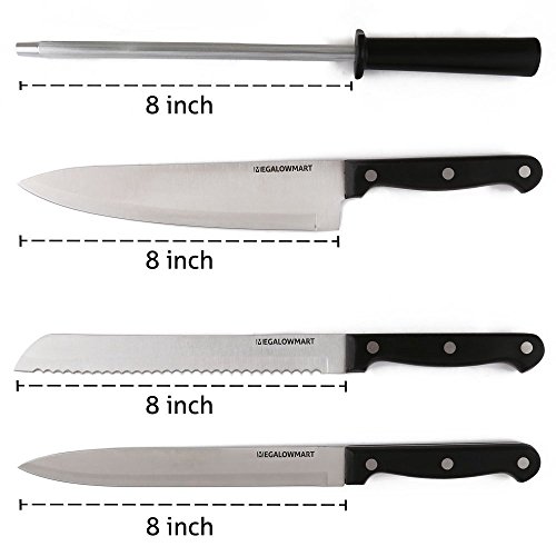 Product Description Package Includes: 4.5" Steak Knife x 6 / 8" Chef's Knife × 1 / 8" Bread Knife × 1/ 8" Slicing Knife × 1 / 4.5" All-Purpose Knife × 1 / 3.5" Paring knife × 1 / Kitchen Scissors × 1 / Sharpening Steel x 1 / Wood Knife Block w/ Felt Bottom x 1 HIGH-QUALITY: MEGALOWMART Knives are sharp and make cutting, chopping, slicing and dicing easy and safe. The premium stainless steel is rust-resistant, stain-resistant and has high edge-retention. The blades have a solid full-tang design which prevents blades falling off. The polypropylene plastic handles are comfortable and easy to maneuver. VERSATILE: This multipurpose set comes with a chef knife, bread knife, slicing knife, all-purpose knife, paring knife, kitchen scissors, 6 steak knives, sharpening steel and wooden knife block. The complete culinary set meets all of your food prep needs and is perfect for use on meat, fruit, vegetables, bread and more. KNIFE BLOCK: All of the kitchenware in this set fit securely in the durable knife block, complete with a soft, padded bottom. The classic and compact look of the storage block saves space and protects your cutlery from damage on countertops. The set is easy to clean. Hand wash the knives. Knife block is NOT dishwasher-safe. 0