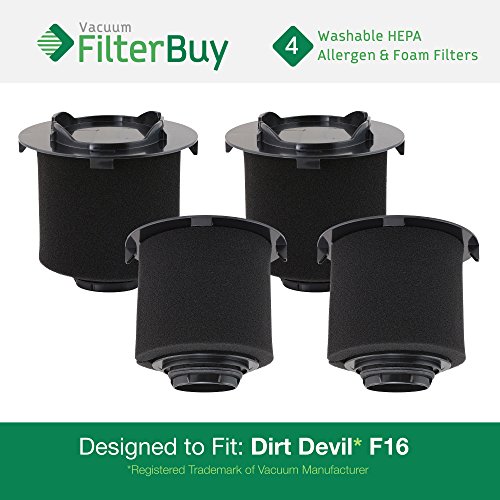 4 - Dirt Devil F16 (F-16) Washable HEPA & Foam Replacement Filters, Part # 1-JW1100-000, 2-JW1000-000. Designed by FilterBuy to fit Dirt Devil Vision & EnVision Wide Glide Vacuums