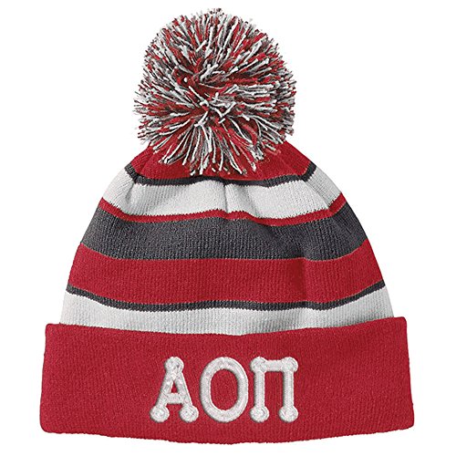 Product DescriptionAlpha Omicron Pi Lettered Comeback Beanie Warm and soft 100% acrylic rib knit Tri-color pom-pom detail on top Folded hem Fit type: One size - Great cute Greek font.0