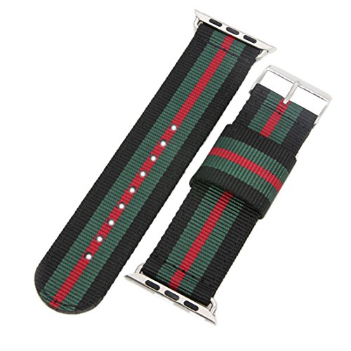 -. Feature : Color of the band: 2black/2green/red with black buckle. Total length: approx. 120mm+80mm, standard/regular length. Please check the size of your watch and choose the same size watch band as your watch case. / Premium quality NATO Zulu style watch band, impresses with the quality of exotic nylon and workmanship, to ensure its extreme strength and durability. The perfect ballistic nylon strap is popular with lightweight, breathable, washable, incredibly soft and comfortable. The NATO Zulu style band, with its reliable, durable, dirt and wet resistant features, can be used either in wet or hot weather. A fantastic NATO style watch strap for you! / The NATO Zulu style band, is perfect with classic watches and suits the sporty, uncomplicated life style of the wearer. The nylon band is widely used in the military and for outdoor equipment due to its unique characteristics. It might not be the height of fashion. However, if you are more concerned about functionality than style, this is a fantastic band for you! / Suitable for your luxury Apple Watch, such as Apple Watch Series 1 Series 2 Series 3 Sport & Edition version 38mm. This watch strap is not an original Apple Watch strap, but a watch strap from a third party manufacturer, suitable for watches from the brand Apple Watch. There is no Apple Watch logo on this watch band. Note: the watch in the image is just for description, not for sale. / The pin buckle is made of exotic high quality 316L stainless steel, for greater resistance to corrosion. The buckle with exquisite workmanship and silky smooth, extraordinary details reflect its high-end quality. All the edges and holes were properly treated by advanced ultrasonic technology to makes it smooth and not scratch hands.