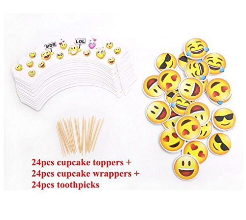 Yunko Emoji Cupcake Toppers and Wrappers Kids Party Cake Decorations, Set of 24