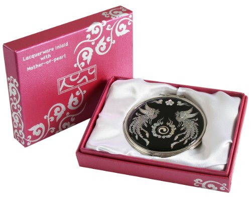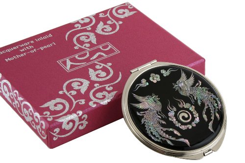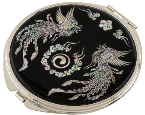 Handmade Handcrafted Mother of Pearl Magnifying Double Compact Cosmetic Makeup Round Hand Mirror lacquer wares inlaid with Phoenix Design