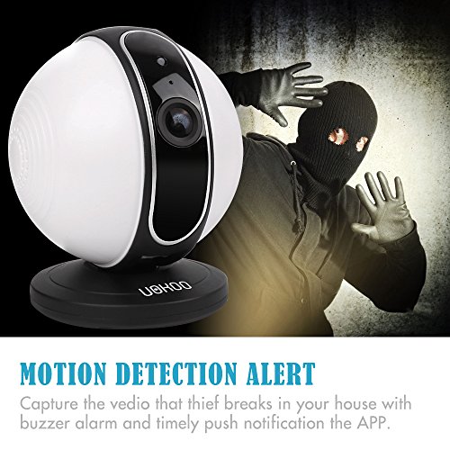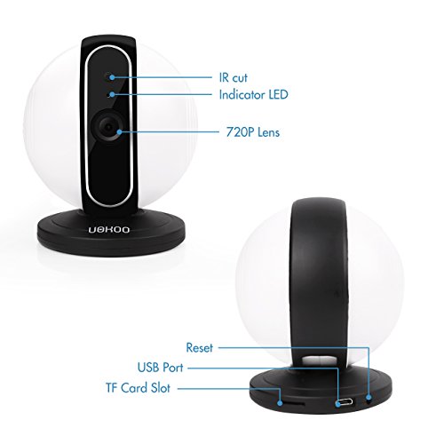 -. Feature : ✔ UOKOO SECURITY CAMERA: 720p High-definition, 90° wide-angle advanced glass lens combined with 355° horizontal & 30° vertical rotation range create a complete 360° coverage. High resolution live streaming delivers you a crystal clear picture with more details to know what's going on when you're away from home. / ✔ ONE KEY CONFIGURATION: Sonic Recognition Technology featuring One Key WiFi Configuration makes setup so quick and easy. Just plug in the power cable, download the uokooer App and set it up via your iPhone or Andriod smartphone, remote access to the wireless security camera on iPhone/ iPad/ Android phone/PC, keep an eye on your loves and belongs anywhere anytime. / ✔ MOTION DETECTION: Check it on your phone even you are far away from home. Get informed about every movement in your house via with motion and sound triggered push notifications along with a 5-second video of the activity will be saved on the TF card. Download the screen captures and video on your phone, do not miss any suspicious image / ✔ NIGHT VISION AND TWO WAY AUDIO: Night vision up to 22-feet, never miss a moment, day or night, with visibility up to 16 feet in complete darkness. Communicate with family, friends and your pets on mobile devices. Talk to camera or listen to camera, there is no distance to communicate with anyone. / ✔ ADVANCED VIDEO RECORDING: Record, store and review footage using a Micro SD card(Minimum support 8G, Maximum 64G) and manage directly from your mobile device; Alert pictures will be stored on the SD card, and you can playback the videos on your phone. Loop recording: When the memory full, it will auto cover the oldest video files.
