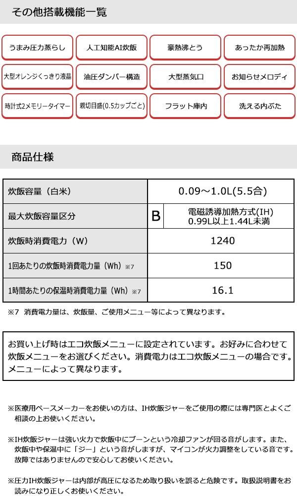 | 付属品 | しゃもじ、しゃもじ受け、計量カップ(白米用・無洗米専用)、取扱説明書兼保証書(保証期間:1年間※内釜フッ素加工:3年間) ※取扱説明書に「お料理ノート」ページあり |