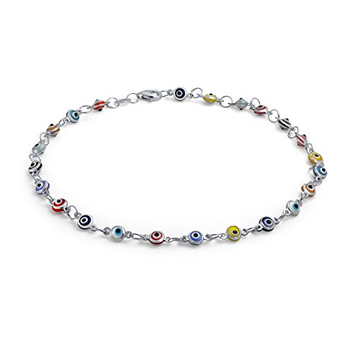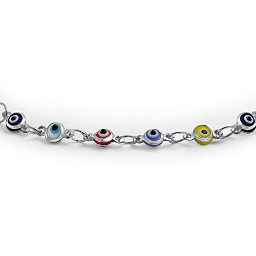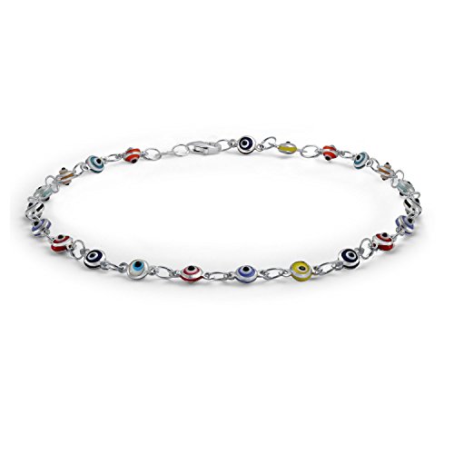 Take a fashion tip from some of the oldest cultures in the world. Evil eye jewelry is fascinating. Who knows, if you beckon vast wealth or spiritual enlightenment you just may get it. But this eye catching multi color evil eye ankle bracelet will attract attention, if nothing else, wherever you go. Playful and dainty, this delicate sterling silver anklet holds 23 small glass multicolor evil eyes. This evil eye ankle bracelet has subtle charm and elegance that is guaranteed to spice up any look. Put a little pep into your step and good spirit into your life.Feature