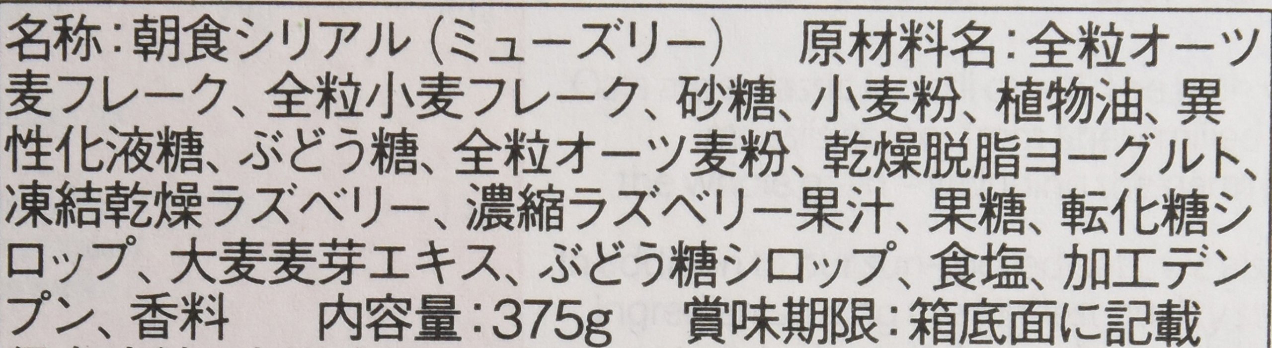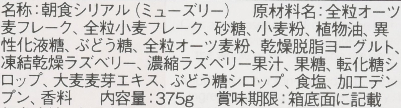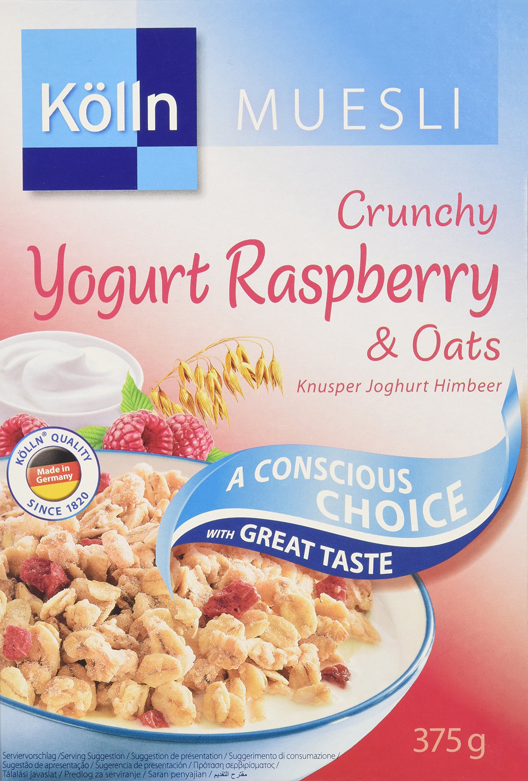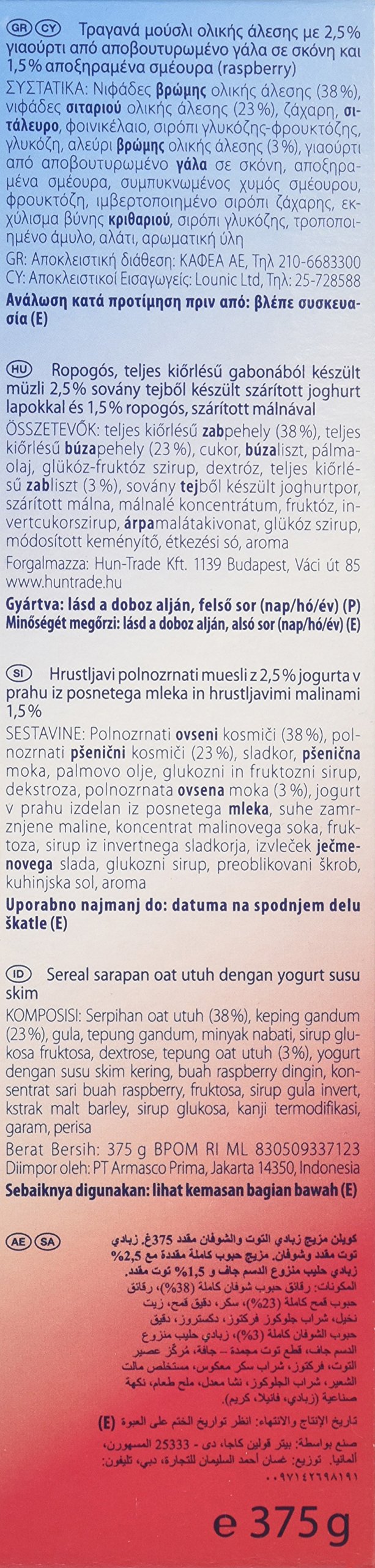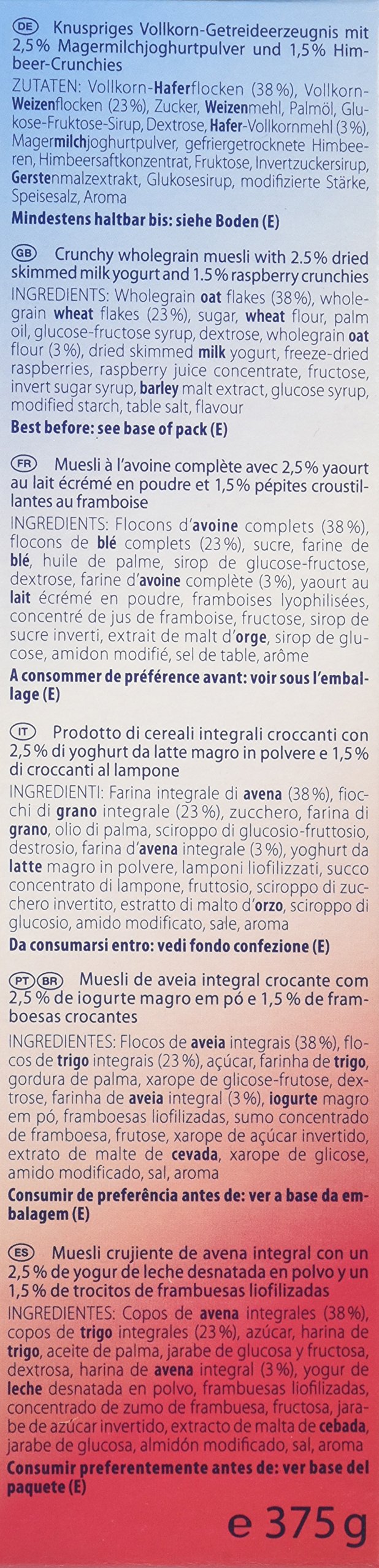 Crunchy type that mixes flakes and raspberries coated with yoghurt powder, using 41% whole grain oats containing 23% of dietary fiber, 23% whole wheat wheat, baked in the oven!