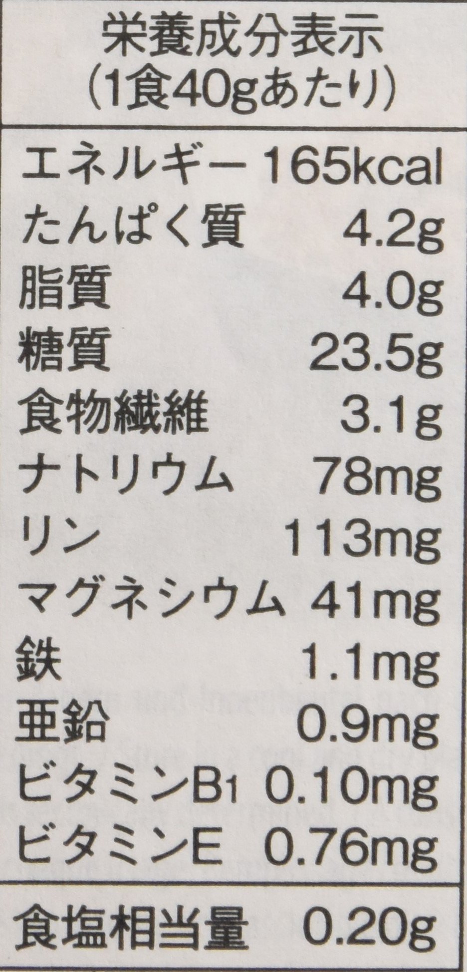 4 g of protein per 40 g of meal, 4.0 g of carbohydrate, 23.5 g of carbohydrate, 3.1 g of dietary fiber, 78 mg of sodium, 113 mg of magnesium, 41 mg of magnesium, 1.1 mg of iron, 1.1 mg of zinc, 0.9 mg of vitamin B, 0.01 mg of vitamin B,