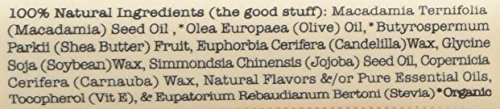 Ingredients: Jojoba Oil, Organic Shea Butter, Olive Oil, Candelilla Wax, Soy Wax, Vitamin E, Organic Natural Flavors, Carnauba Wax, Mica & Stevia