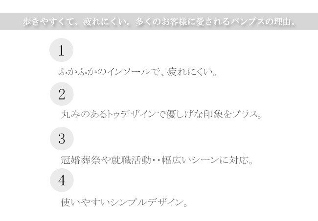 | 商品説明 | 冠婚葬祭・就活に…1足あれば困らない定番リクルートフォーマルパンプス [21.0cm~25.5cm]の豊富なサイズ展開♪ ※輸送上の都合により、多少の汚れ・シミなどが見られる場合がございます。 また、発送上の状態によって商品がシワになる場合がございます。予めご了承くださいませ。 |