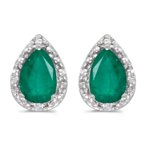These 10k white gold pear emerald and diamond earrings feature 6x4 mm genuine natural emeralds with a 1.24 ct total weight.