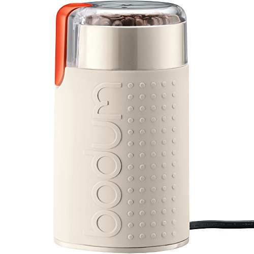 Studio : Bodum Publisher : Bodum Binding : Kitchen Product Description There's more to great coffee than choosing exquisite beans and the right brewing method. Freshly grinding the beans right before they come in contact with hot water makes the difference in taste that real coffee connoisseurs appreciate. The bistro blade grinder is the perfect tool for this. It's small enough to stay put on the counter for easy access and its cable can be stored inside the grinder at the bottom. It's got a transparent lid so the fineness grade can be observed. The longer the grind the finer the powder. This powerful and handy grinder is made from stainless steel, plastic and rubber and it comes in a selection of black, orange, red, green, and white to fit any kitchen counter's color scheme. The bistro grinder can also be used to grind spices and what's. We think it's quite cute. 0