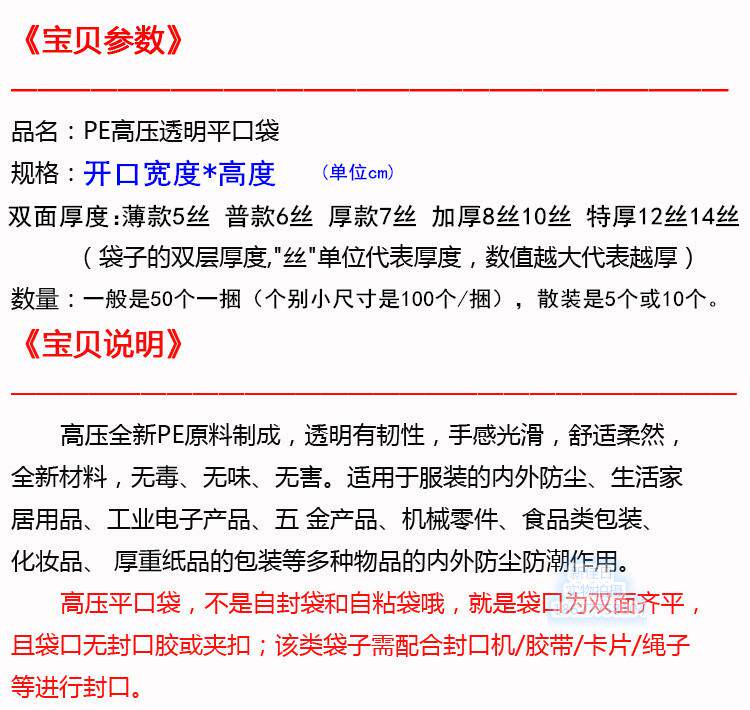 说明:平口袋又名【开口式自封袋】,就是袋口为双面齐平,且袋口无封口胶或夹扣;该类袋子需配合封口机、胶带、卡片等进行封口。平口袋主要有三种厚度供客户选择,一种为6丝的袋子,相对较薄,另外一种为双面10丝,12丝,还有一种14丝的,均比较厚。但不是每一个规格都具有这四种厚度,客户如有需求,请参考下面的规格列表进行选购。平口袋是包装各种物品的用品之一,它可以为产品包装提高一个层次,也体现了一个良好卖家的细心,用心,价格低廉,却可以改变给客户一个良好卖家的形象。