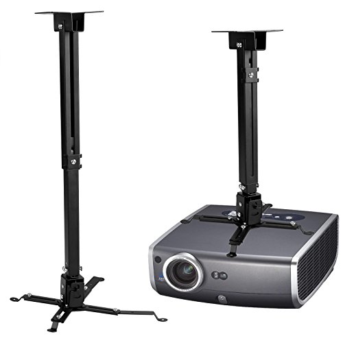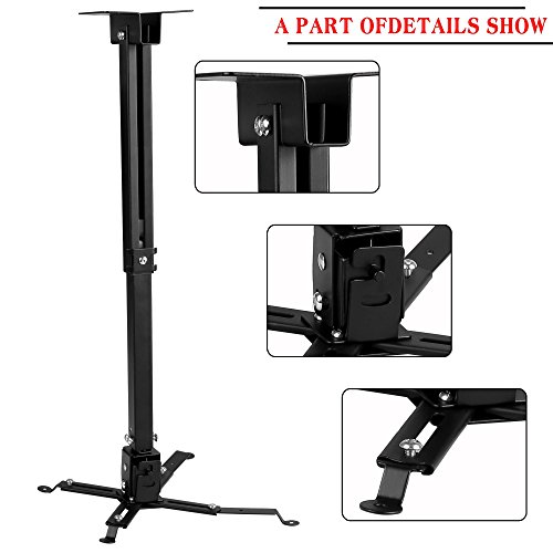 Product feature: Material: Iron Color: Black Quantity: 1set Load weight: 44lbs (Max) Height: 37.5-57.5cm/14.63-22.43 inch Ceiling plate dimensions (square): 4 x 4 inch Universal Mounting with 4 fully adjustable and extendable swing arms to accommodate various mounting Compatible with most projectors that use 3 or 4 holes for mount Fits projectors with mounting holes up to 11\" apart. (To determine if this mount work for your projector, simply measure the diagonal distance from one mounting hole to the other. This mount should work If the distance is less than 11\") Removable extension arm with variable height adjustment: 4.7\" (without arm) and 16.9\" to 25.6\" (with adjustable arm) 15 degree tilt, pitch and yawl adjustable Package Content: 1 x Ceiling Projector Mount Bracket (with all screw kit for installation) Note: Due to the difference between different monitors, the picture may not reflect the actual color of the item. We guarantee the style is the same as shown in the pictures, but not the same performance on different bodies as on the model. Thank you! 0