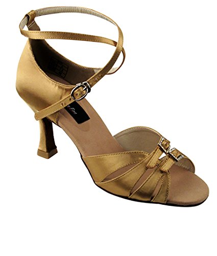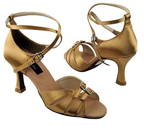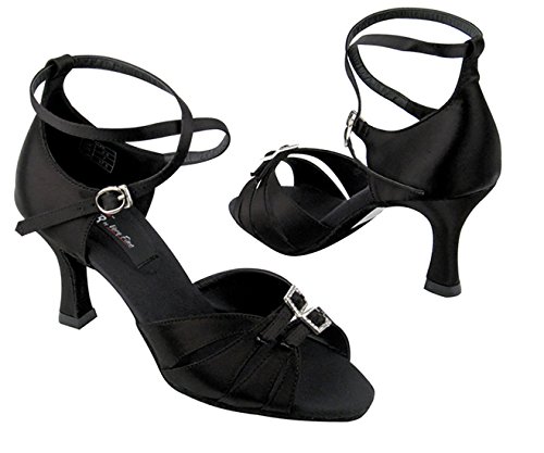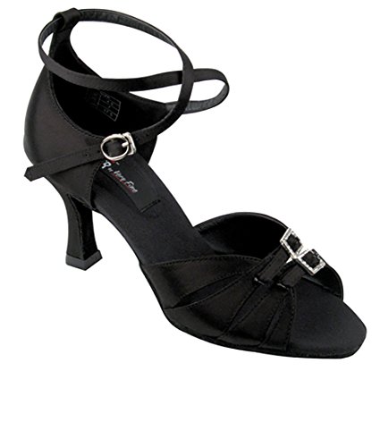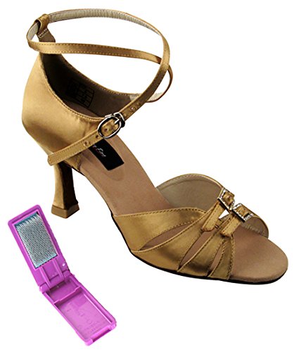 * Professional line made by Very Fine Dancesport designed for professional competitors and dancers. Made with premium satin. Quick release buckling (buckle clip/hook). Non Slip Suede Sole. * Non-slip insole made with certified nano-fiber that deodorizes the shoes after long hours of dancing. Professional ultra soft suede outer sole makes it ultra light. * Extra padded footbed using latest memory padding technology provides both comfort and long lasting. * Extra thick memory padding designed to absorb shock and provides strong resistance against high pressure and pad deformation. It lasts average 10 times longer than other major brands. * 3-inch Flare heel in the photo. Bundle of Pair of Dance Shoes and Foldable Dance Shoe Brush.