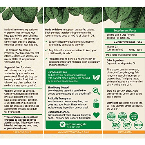 PREMIUM VITAMIN D3 AND SUPER ABSORBABLE: Vitamin D3 is converted by the body 500% faster than Vitamin D2. That's why we chose to source our Vitamin D3 from purified lanolin which we combine with premium extra virgin olive oil to help your baby's body to absorb the full benefit. Because Vitamin D3 is chemically indistinguishable from the form of vitamin D produced by the human body, it's easier to metabolize and absorb. 400 IUs of pure, sunny vitamin D3 made with love for your child.