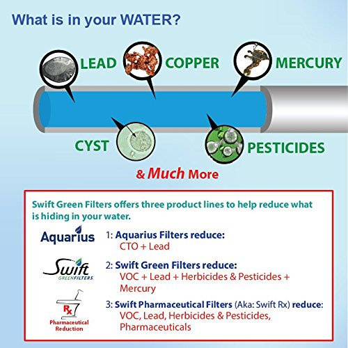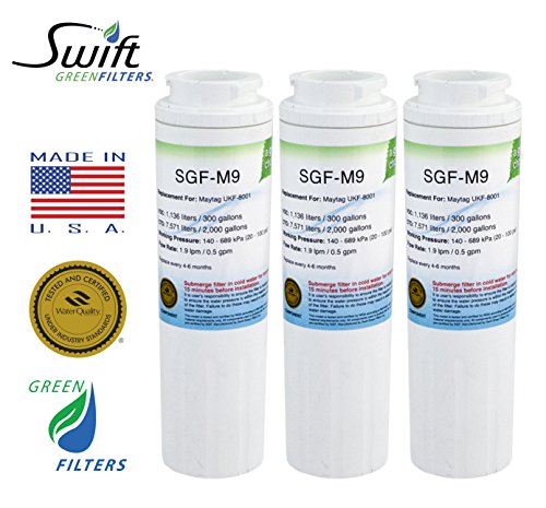 "The Swift Green Filters SGF-M9 water filter is a compatible replacement providing fresh, clean, and great tasting drinking water. This high quality filter reduces: CTO, VOC, LEAD, Herbicides, & Pesticides. Our filters are made with activated carbon produced using a new technology that carbonizes dried coconut shells. Coconut carbon is superior to other sources of activated carbon. It has 50% more micro-pores for capturing contaminants. For more information please visit the Swift Green Filters website. Change filter frequency: every 4-6 months Made in USA & CANADA From the Manufacturer: We offer a variety of filters that are compatible with all leading brands. Swift Green Filters are the Green alternative to the conventional filter, our products being environmentally conscious while cost effective. We aim to provide you with the cleanest and healthiest water filtration for your home and business by making sure the materials we use are to the highest quality standard. "Feature