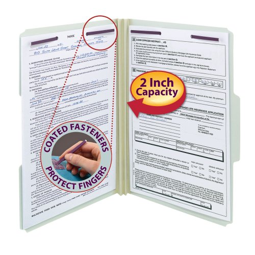 -. Feature : Protect your documents and fingers with Smead's patented SafeSHIELD® Coated Fastener Technology / SafeSHIELD(TM) coated fasteners prevent paper tears, finger cuts and excessive fastener crinkling / Heavy duty pressboard stock and Tyvek® gusset for extra durability / Made for large bulky files that get plenty of use / Two fasteners keep papers secure and in order / Contains 60% recycled content, 30% post-consumer material