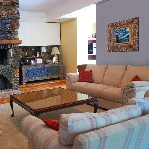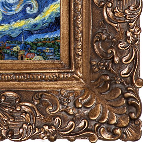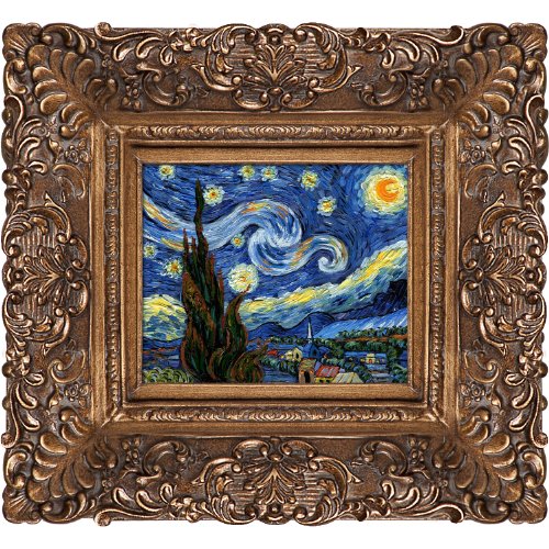 Hand painted oil reproduction of one of the most famous Van Gogh paintings, Starry Night. The original masterpiece was created in 1889. Today it has been carefully recreated detail-by-detail to near perfection as a complete canvas art reproduction. Why settle for a print when you can add sophistication to your rooms with a beautiful fine gallery reproduction oil painting. One of the today's most recognized paintings, Starry Night by Vincent Van Gogh is a classic painting that invokes emotions from the serenity of the church steeple to the wild abandon of color used for his late night sky. Imagine the movement of the painter as he twists and turns his brush to create the dance between the stars and the clouds under the calm, peaceful village. Vincent Van Gogh's restless spirit and depressive mental state fired his artistic work with great joy and, sadly, equally great despair. Known as a prolific Post-Impressionist, he produced many paintings that were heavily biographical. This work of art has the same emotions and beauty as the original by Van Gogh. Why not grace your home with this reproduced masterpiece. It is sure to bring many admirers! Frame Description: Burgeon Gold Frame-Organic Pattern Facade with Gold Finish.Feature