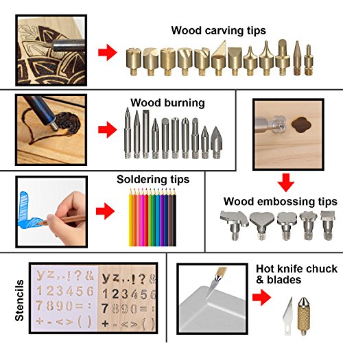 - Full Set Kit -1 x Adjustable temperature Pyrography Woodburning Pen,5 x Assorted Wood Embossing Tips,4 x soldering iron tips,10 x Assorted Wood Carving Tips,10 x Assorted Wood Burning & Soldering Tips,1 x Hot Knife Chuck with 1 x Blades,1 x converter,2 x tweezers,2 x Stencils,1 x Wood Burning Pen Holder,1 x Carrying Case,1 x User Manual.