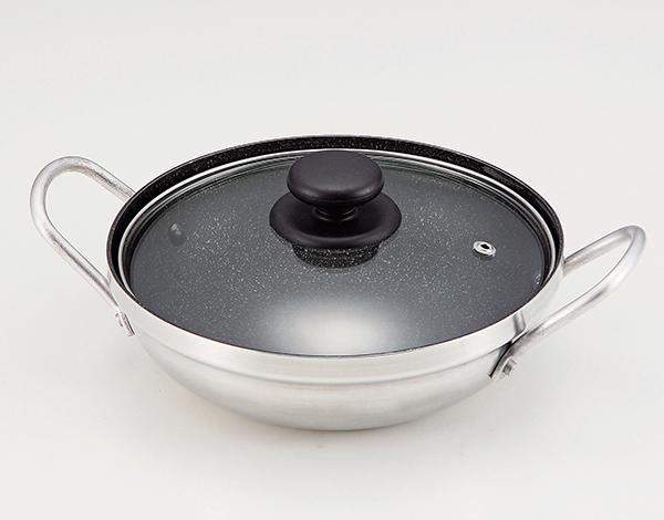 | 素材・材質 | 本体・取っ手:アルミニウム合金(内面:ふっ素樹脂塗膜加工) 蓋:強化ガラス(全面物理強化) 金属部:ステンレス鋼 つまみ:フェノール樹脂(耐熱温度:150度) つまみの座板:ナイロン(耐熱温度:180度) |