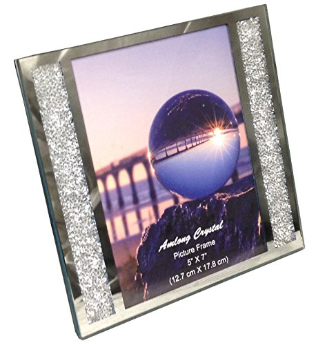 -. Feature : A classic mirror and diamond design to add sparkle to your favorite photographs. / Minature diamonds encased inside the frame add a touch of elegance. / Has a unique screw on metal support instead of less sturdy cardboard flip out support found on most frames. Cannot be hung on walls. / Holds one 5"x7" picture. Frame Size: 7.6" x 7.28" / Comes in Amlong Crystal Gift Box