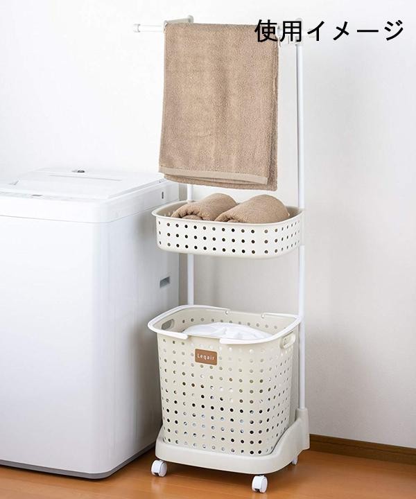 | 上バスケットは、バス用品などの小物整理にお使いいただけます。ハンドル付バスケットは移動に便利。バスタオルや、脱衣などをかけられるハンガーも付いています。3つがまとまっており、さらにキャスター付きで移動も簡単です。 |