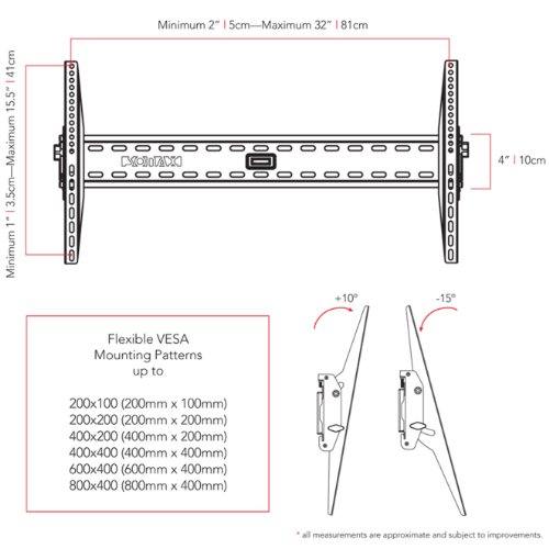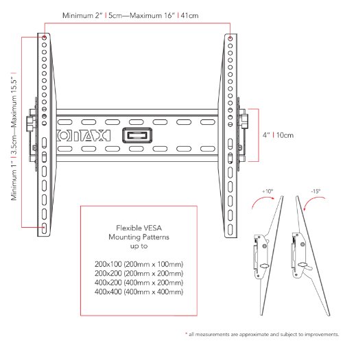 -. Brand : Sonax -. Feature : 10? / -15? up and down tilt with leveling system / Fast and simple wall mounting / Holds up to 45kg/100 lbs / Low profile of only 7.4 cm from TV to the wall / VESA Mounting up to 400 x 400, Fits Most 32" - 55" TV's -. Label : Sonax -. Manufacturer : Sonax -. MPN : M-415-MPM -. PartNumber : M-415-MPM -. ProductGroup : Furniture -. ProductTypeName : HOME_FURNITURE_AND_DECOR -. Publisher : Sonax -. Size : 32 55 TV -. Studio : Sonax -. Title : Sonax Tilting Flat Panel White Wall Mount for