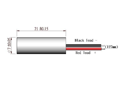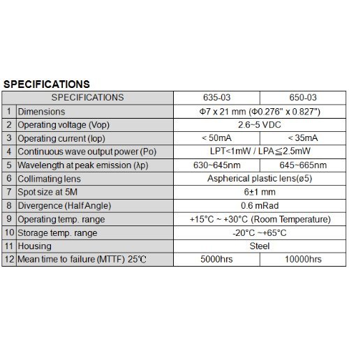 Wave length: 650nm. Output power: Class IIIa - less than 5mW. 2.6~5 VDC operation. Dimensions: D7 x 21 mm.