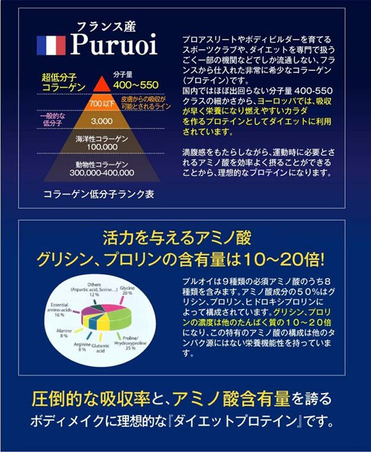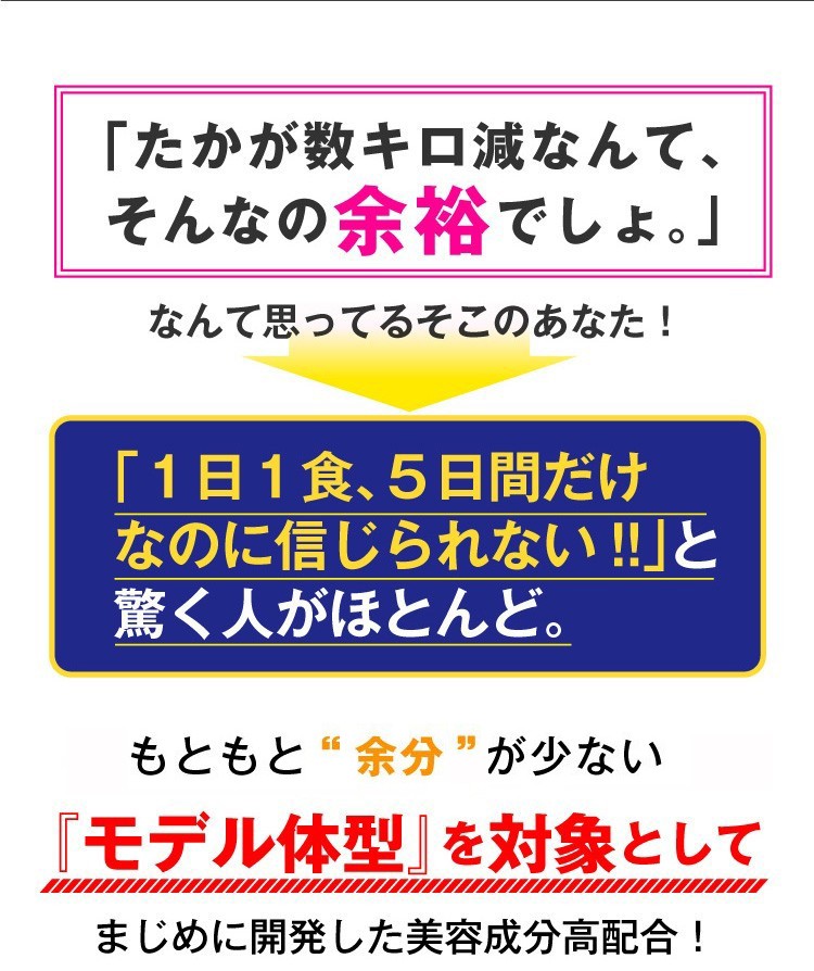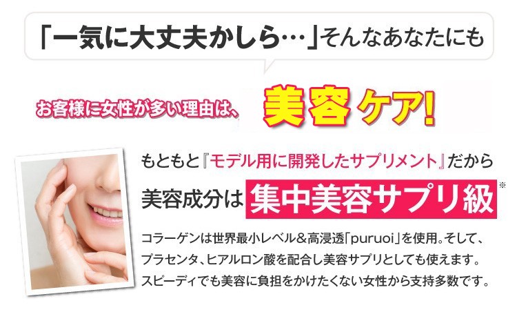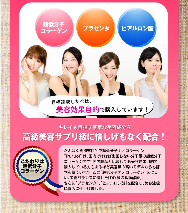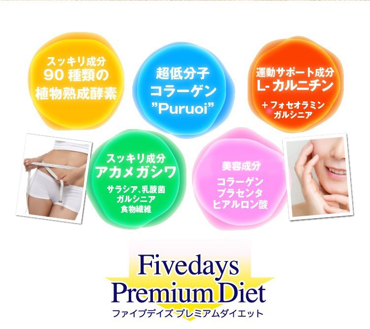 コラーゲンペプチド(魚由来)、エリスリトール、 L-カルニチンフマル酸塩、アカメガシワエキス末、植物発酵 エキス末(デキストリン、オリゴ糖、砂糖、てんさい糖、ヨモギ、 その他)、食物繊維、サラシアレティキュラータエキス末、白い んげん豆エキス末、乳酸菌末(殺菌乳酸菌、デキストリン)、 ガルシニアエキス末、豚胎盤エキス末、酸味料(リンゴ酸)、 香料、着色料(アントシアニン)、甘味料(アスパルテーム・L- フェニルアラニン化合物、スクラロース)、卵殻カルシウム、ヒ アルロン酸、(原材料の一部に乳、豚肉、りんご、やまいもを含む)