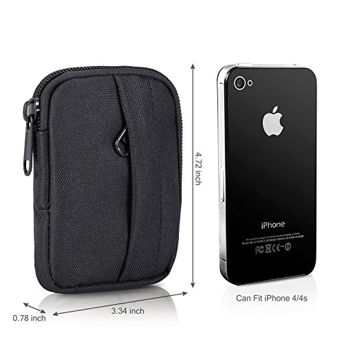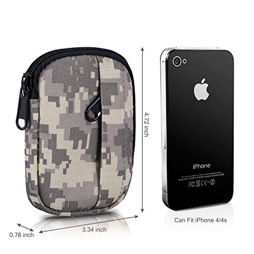 -. Feature : 2 Pockets: 2 zippered pockets+ for storage and organization; Fit for small cell phones(iPhone 4S 4),watches,gadgets,folding knife,lighter, cigarette,credit cards, keys, changes,lip stick,other sundry and EDC.An ideal EDC bag organizer for accessories / Dual-layered & Waterproof:Neoprene material inner lining durable; canvas nylon outer shell is anti-tear,rainproof and dust proof. Made from Military Grade Materials / Molle Compatible System: Offers a secure, tight fit when attached to any Molle gear:tactical backpacks, military bags, tactical vest and more / Travel & Outdoor Essentials:Climbing,camping,cycling,hiking, biking, boating and other outdoor activities / Portable:Hanging in the main backpack or vest,also can be hung on a belt as a waist bag when you are doing outside activities or in gym.H*Dia. 4.9(Height) *3.3(Length) * 1.7(Width) "