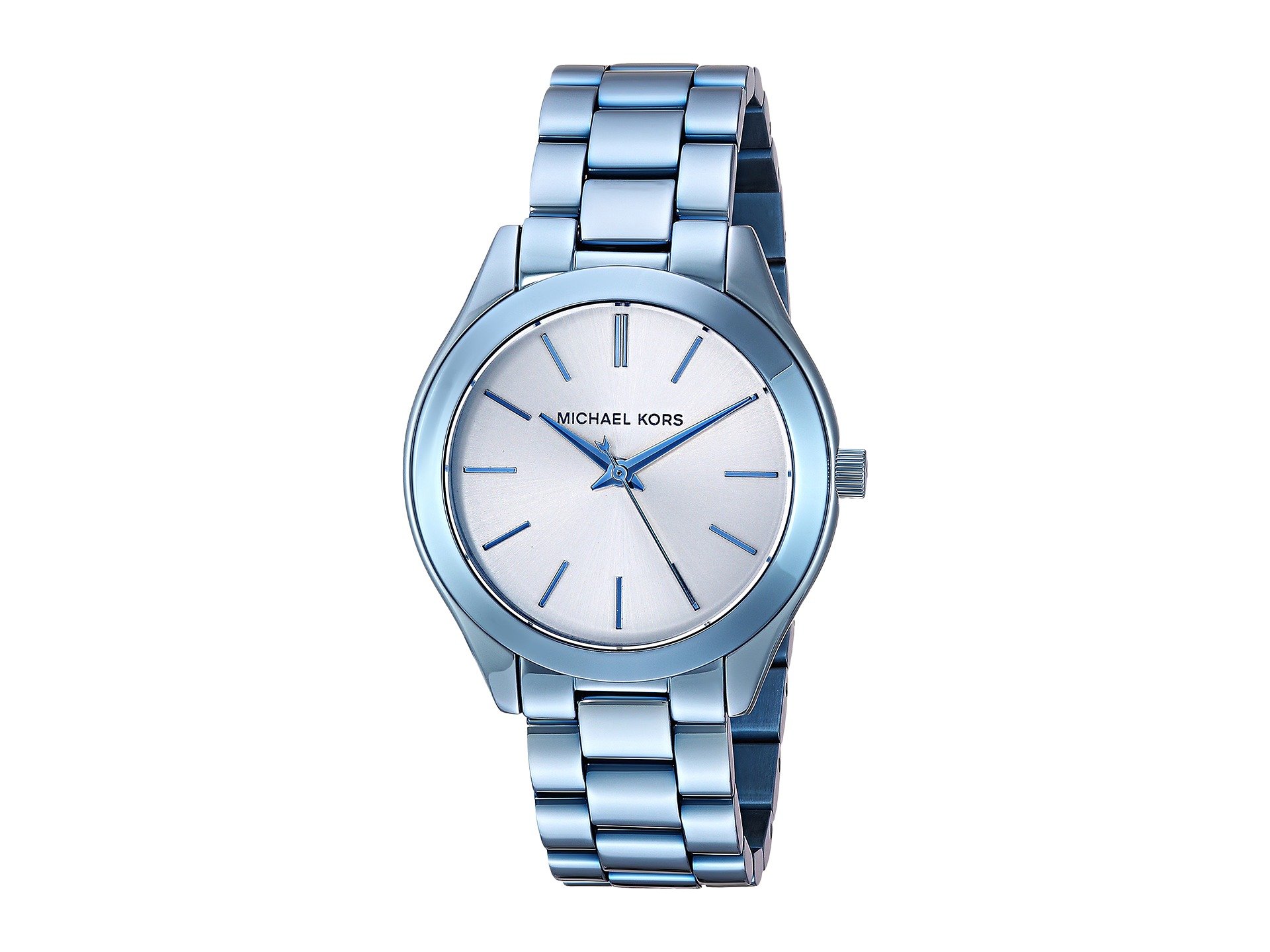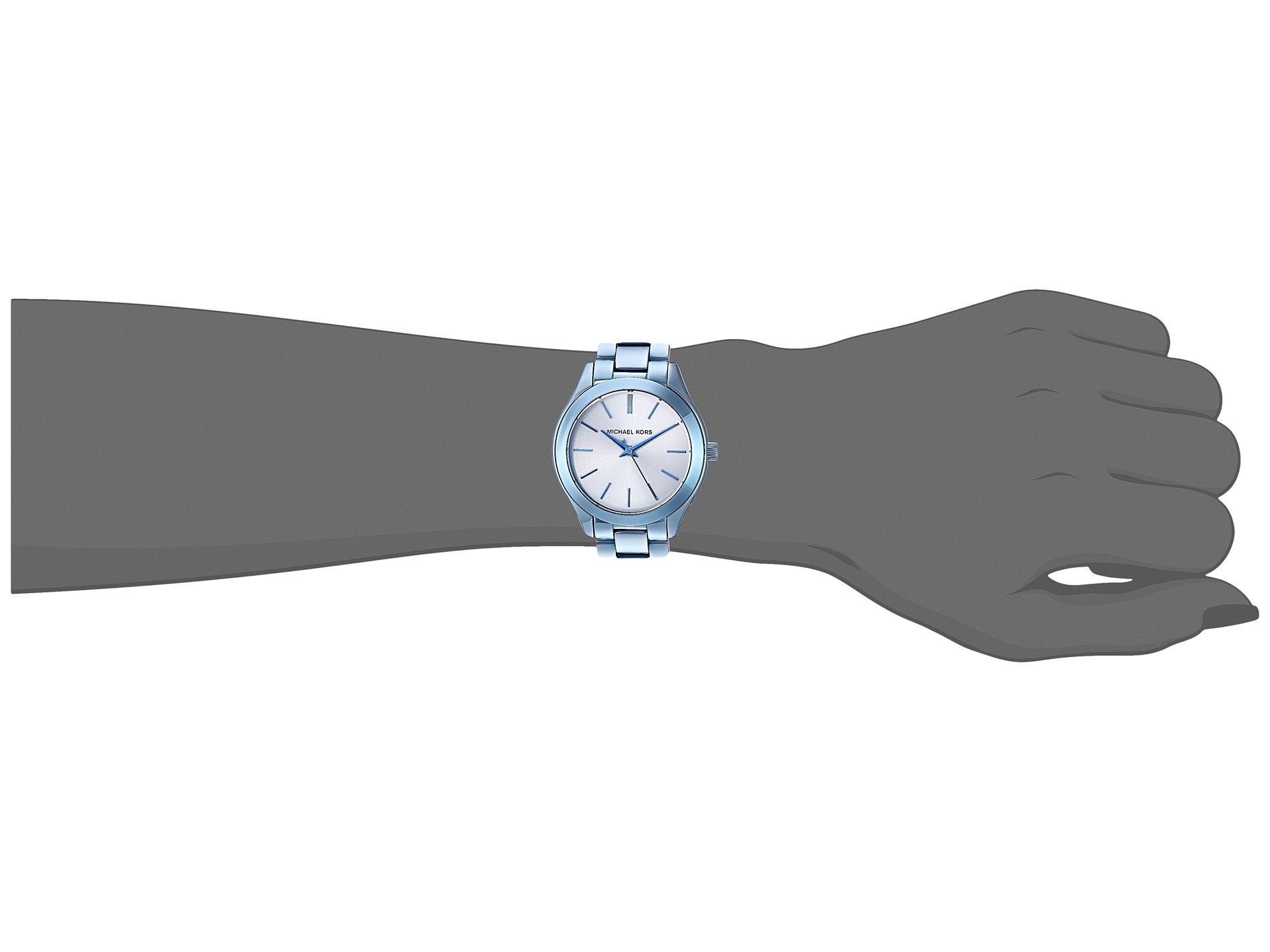 | Product Information SKU: #8942705The bold ocean blue IP Michael Kors? Mini Slim Runway watch is polished perfection. A three-link bracelet and silver sunray dial with ocean blue IP logo and indexes add up to a glamorous, wear-with-everything timepiece.Stainless steel case.Blue, ion-plated stainless steel bracelet with fold-over, double push-button release. Round face.Three-hand analog display with quartz movement.Dial features blue-tone hands, hour markers, and Michael Kors detailing.Water resistant up to 5 ATM.Display case included.Imported.This product may have a manufacturer's warranty. Please visit the manufacturer's website or contact us at warranty@support.zappos.com for full manufacturer warranty details.Measurements: Case Height: 34 mm Case Width: 34 mm Case Depth: 8 mm Band Width: 15 1?4 mm Band Circumference/Length: 8 1?2 in Weight: 2.8 oz |