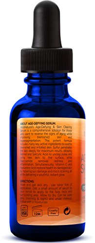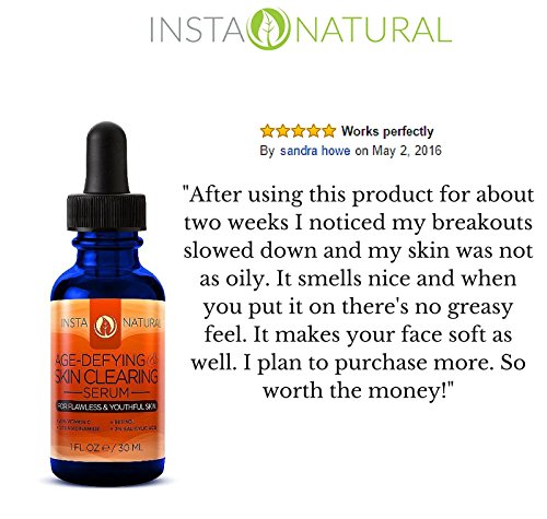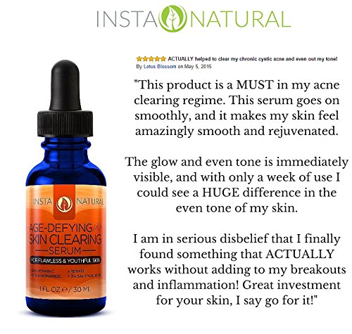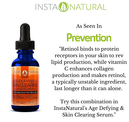 -. Feature : A PROVEN FORMULA THAT OFFERS REAL RESULTS - For a fraction of the cost of a spa, try InstaNatural's Age Defying Skin Clearing Serum. This natural serum contains ingredients to soothe blemishes, acne and irritated skin, including 2.5% Retinol, 2% Salicylic, Tea Tree Oil & Niacinamide. Retinol and Salicylic Acid decongest and unclog pores, while Niacinamide diminishes redness and inflammation. / AS SEEN IN PREVENTION MAGAZINE - InstaNatural's Age-Defying Skin Clearing Serum was featured in Prevention Magazine as the best anti-aging skin serum for a reason! The nourishing natural and organic ingredients in this superb serum deliver powerful restorative nutrients into the skin to dramatically reduce signs of aging like no other. If you want a youthful look that lasts, this serum has all you want, and more! / WORKS FOR EITHER MEN OR WOMEN, ALL SKIN TYPES, YOUNG OR OLD - Our Age-Defying Skin Clearing Serum is full of natural and organic ingredients that make it safe and suitable for all skin types - even oily skin. Glides on smoothly and absorbs fast and won't irritate or burn your skin! Imagine the feeling of not worrying about your skin anymore. Watch your wrinkles, sunspots, and age spots diminish in appearance. / EXPERIENCE THE ANTI-AGING, SKIN IMPROVING BENEFITS FOR YOURSELF - If this Age-Defying Skin Clearing Serum (infused with Retinol, Salicylic Acid, Hyaluronic Acid and more) didn't provide real results, we wouldn't exist. / NO OTHER PRODUCT COMES CLOSE TO THIS. HERE'S WHY This formula comes with professional strength 20% Vitamin C, a powerful antioxidant that repairs damaged skin and protect against future damage. Also contains Hyaluronic Acid, which boosts the skin's ability to retain moisture. These two ingredients work well together to renew skin and reduce the signs of aging, including wrinkles, fine lines and hyperpigmentation.