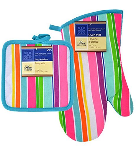 3 Piece Oven Mitt Pot Holder Set Spring Stripe Design