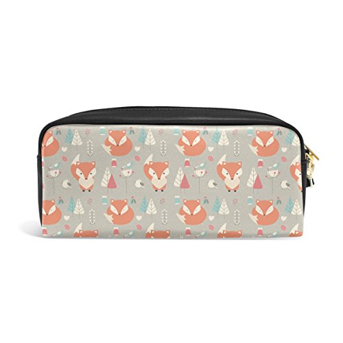 LORVIES Fox Pattern Portable PU Leather Pencil Case School Pen Bags Stationary Pouch Case Large Capacity Makeup Cosmetic Bag